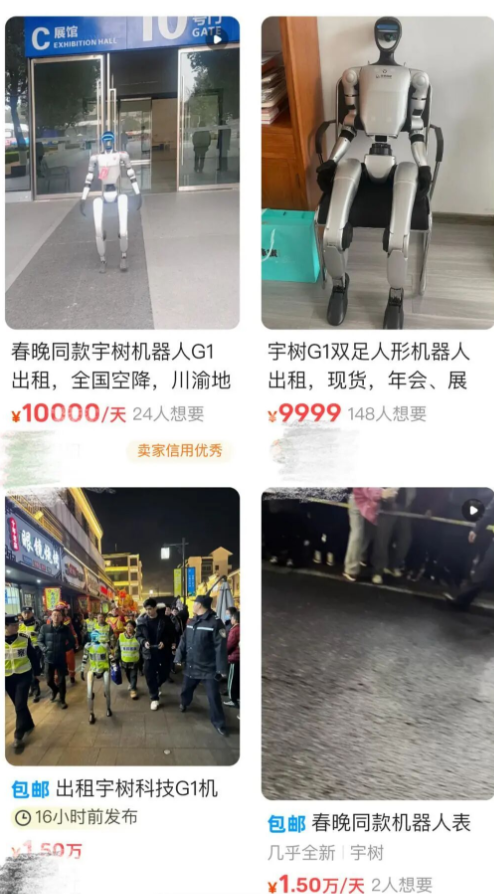 同时,机器人在文娱商演领域应用的火热情绪也催生了另一条赛道,那就是机器人租赁。春晚结束后的一个月左右也是租赁机器人最贵的一段时期。在 2 月份,宇树 G1 机器人的租赁价格甚至达到了 1.5 万元一天。