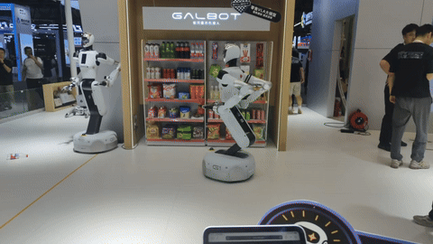 银河通用搭载零售 VLA 模型的轮式人形机器人可以充当店员,顾客在平板上挑选商品后,它会从货架上选出对应的商品放在桌子上。