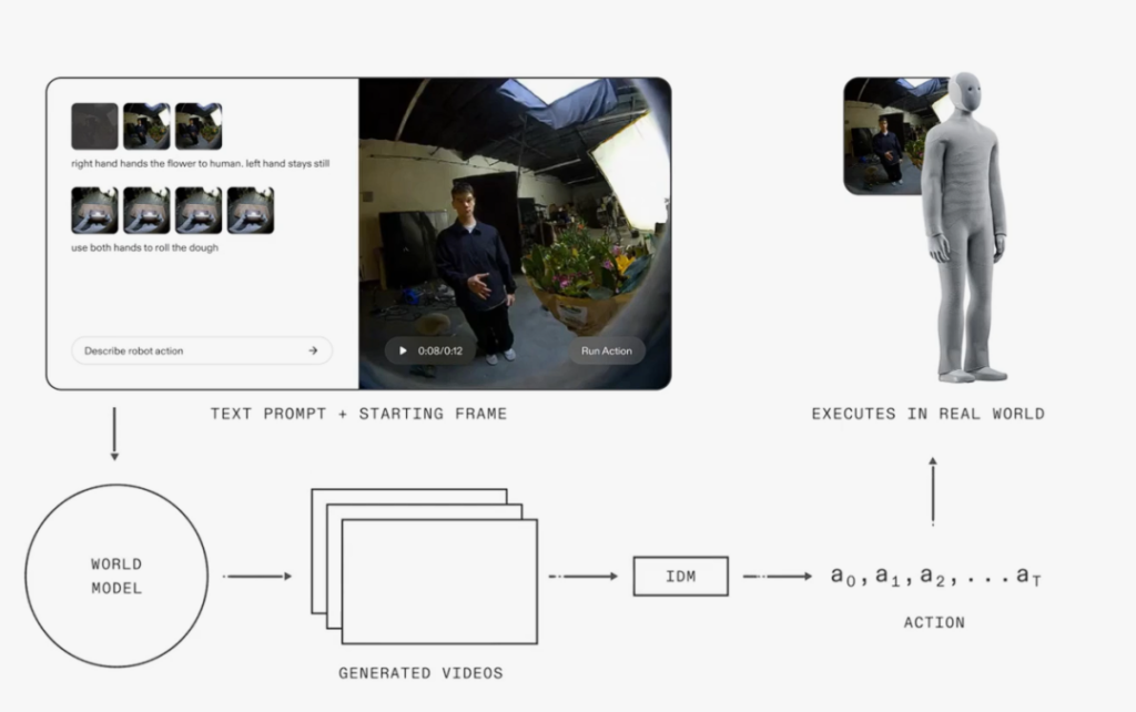 比如用户提出具体指令后,1XWM 会先生成文本驱动的视频推演,想象这个任务的全流程。然后通过逆动力学模型将视频转化为关节指令,让机器人复现想象中的行为。