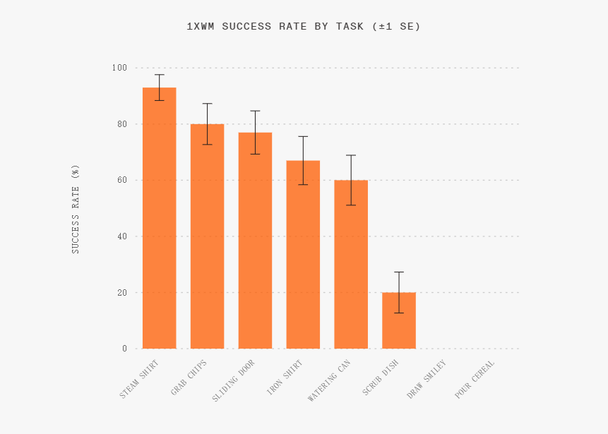 通过 1XWM 创建的飞轮,NEO 机器人可以自己进行探索和策略上的细化,而不是受专家演示的限制,这样自我提升的飞轮也让 NEO 距离进入家庭中工作的终极目标又近了一步。