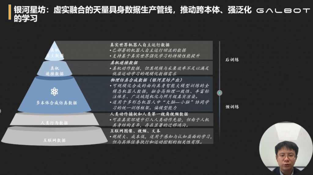 而且数据来源上,王鹤强调了多本体合成仿真数据,有了多本体合成仿真数据、人类行为数据和互联网数据做预训练后,再通过少量的真机遥操数据做后训练,从而可以得到一个高效的机器人的具身模型。