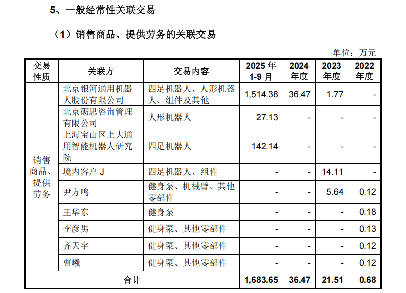 招股书显示,2025 年 1 月到 9 月,宇树科技向北京银河通用机器人股份有限公司销售商品金额为 1,514.38 万元。