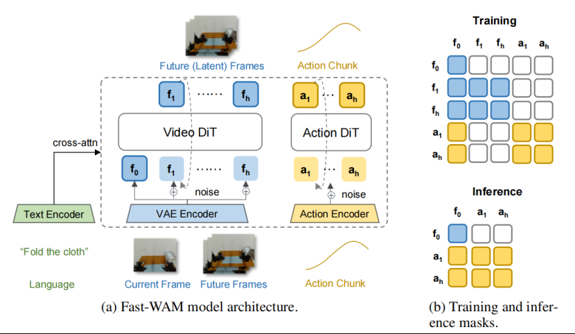 - 训练阶段:Fast-WAM 没有抛弃世界模型最核心对世界动态的建模。在训练过程中,它依然输入当前观测 + 动作。预测未来的视觉变化,但这里的重点不在生成视频本身,主要是通过视频预测,让模型学会世界的因果结构和物理规律。