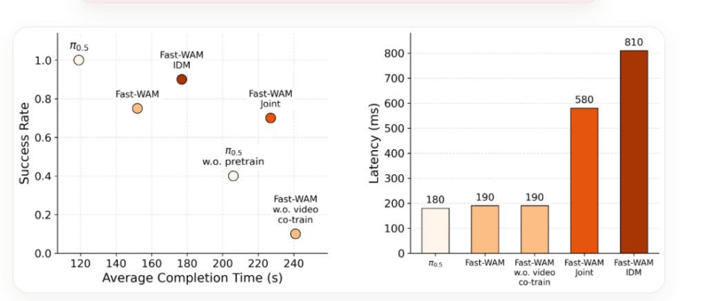 如果说前面的变化还停留在范式层面,那么 Fast-WAM 最直接的结果,就是推理速度的显著提升。
