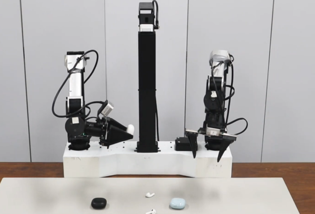 在新的能力演示中,小米给出的是一个整理耳机的任务。面对桌面上三组不同的无线耳机,机器人需要根据颜色判断每个耳机属于哪个耳机盒,并将其放入耳机盒内。