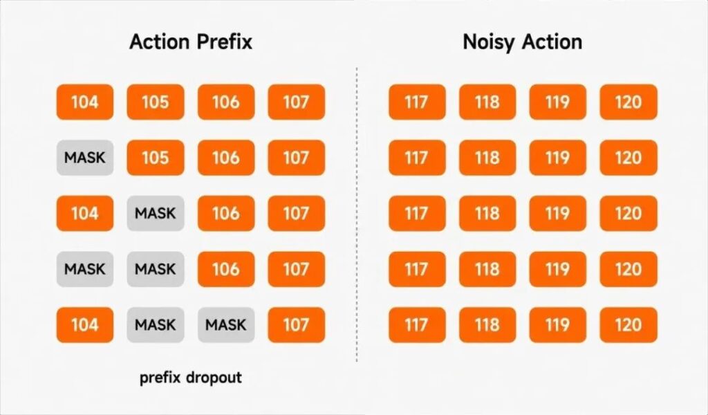 - 主动制造不确定性:通过对动作前缀进行随机遮蔽,模型在训练时无法始终依赖完整的历史动作信息,只能被迫更多地依赖视觉和传感器信号来完成决策。