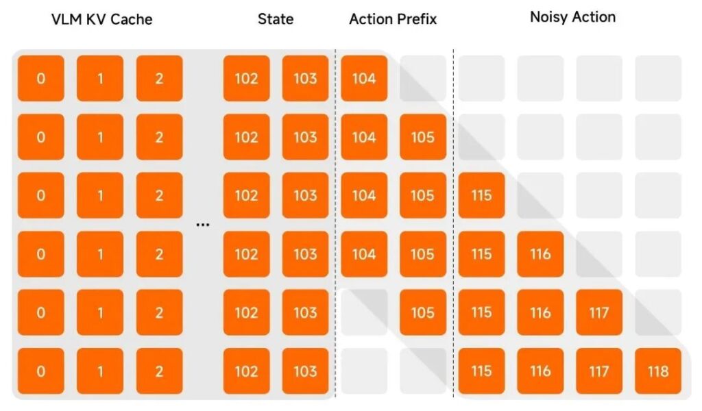 - 在注意力结构上做限制:通过引入 Λ 型注意力掩码,模型在参考前序动作的同时,被约束必须关注当前视觉输入。从结构上避免模型只沿着历史轨迹滑行,让「看见现在」变成一个无法绕开的过程。